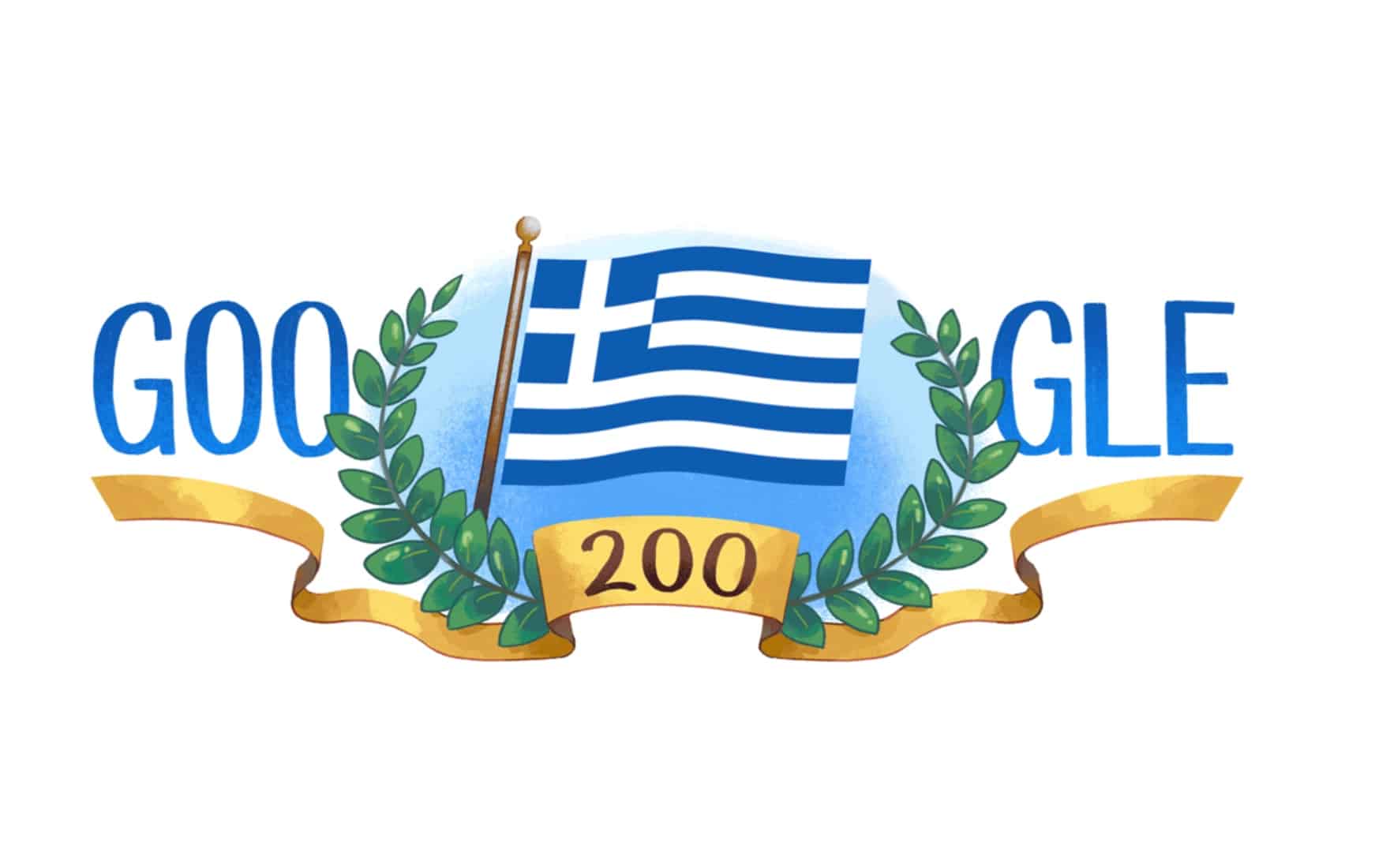 The Greek flag, an olive wreath and the blue color in the letters of Google compose today's special anniversary doodle, created this time to mark the 200th anniversary of the Greek Revolution.